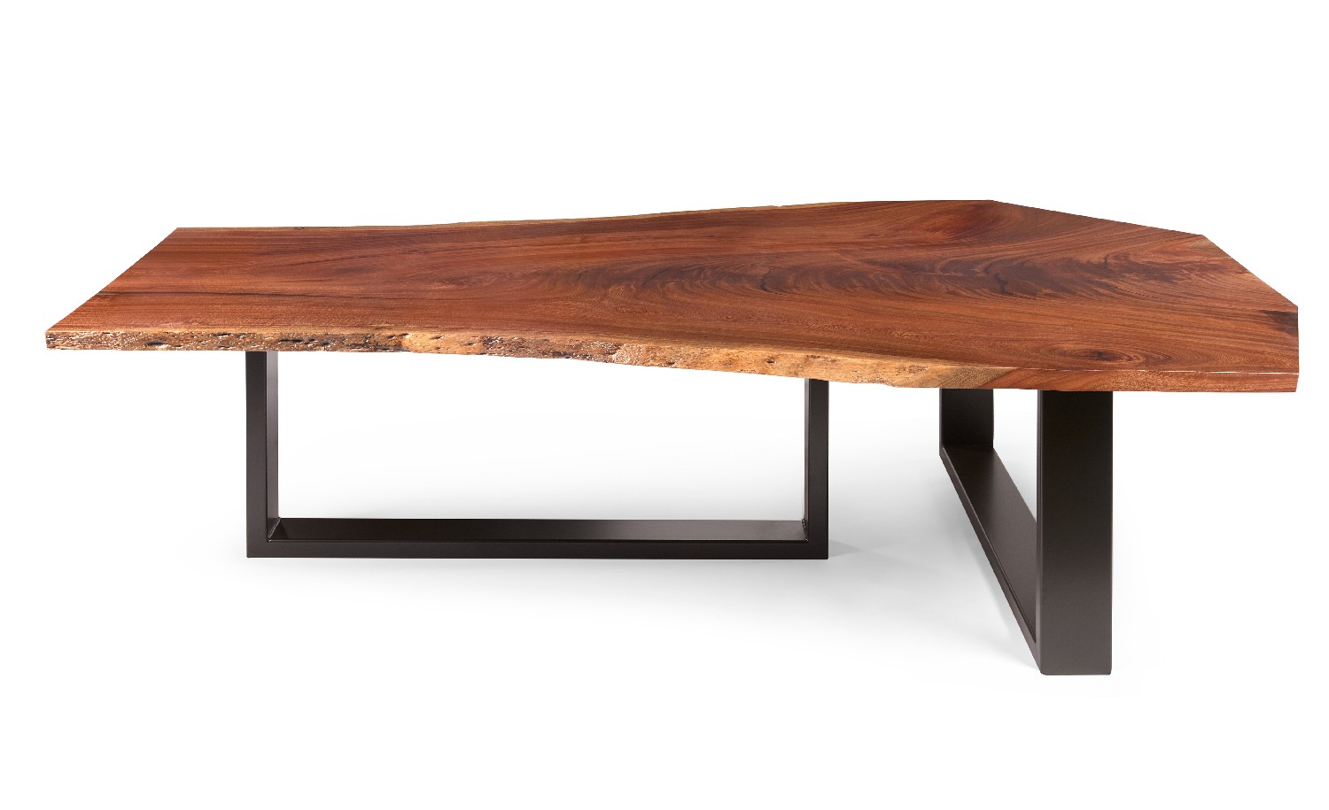 Descubre una mesa de madera noble y muy valorada. Esta mesa Kossipo destaca por su forma irregular, ensanchándose gradualmente hacia uno de sus laterales, y por los detalles en resina epoxi. Una pieza de lujo con mucha presencia.